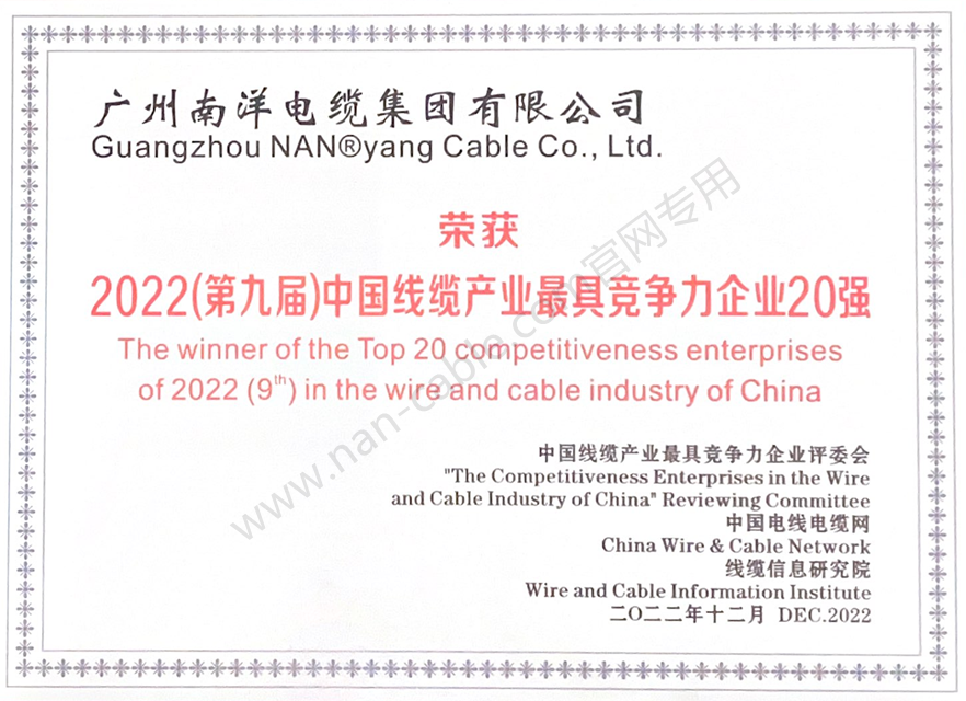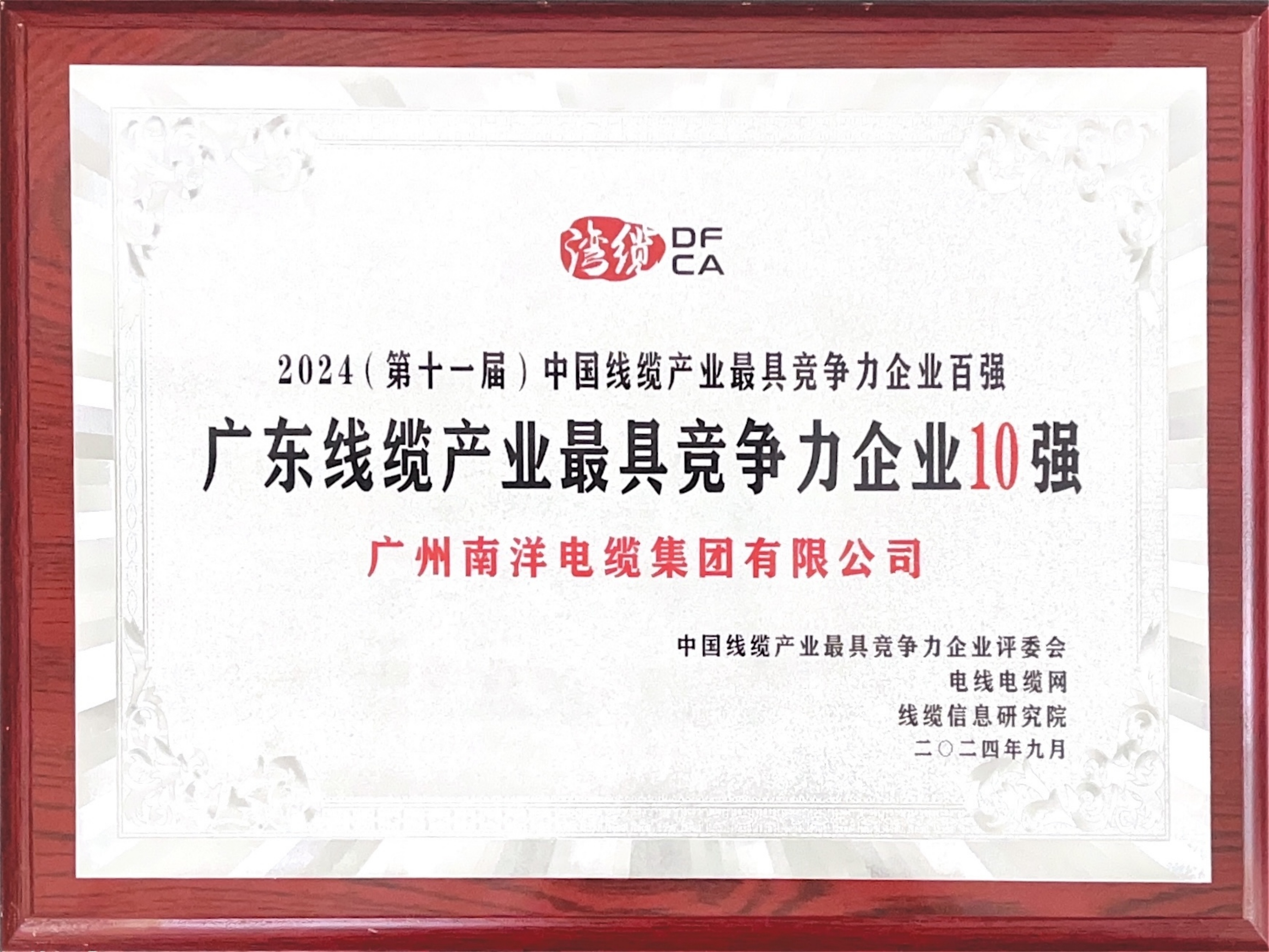 廣東線纜行業(yè)最具競爭力企業(yè)第一名、中國線纜行業(yè)最具競爭力企業(yè)20強、華南地區(qū)電線電纜研發(fā)制造龍頭企業(yè)